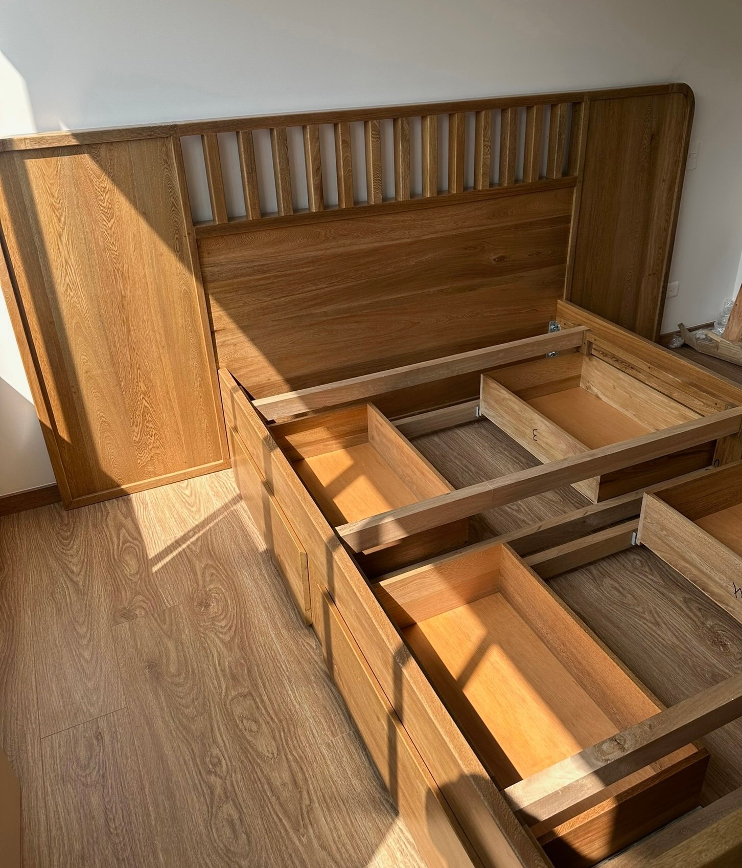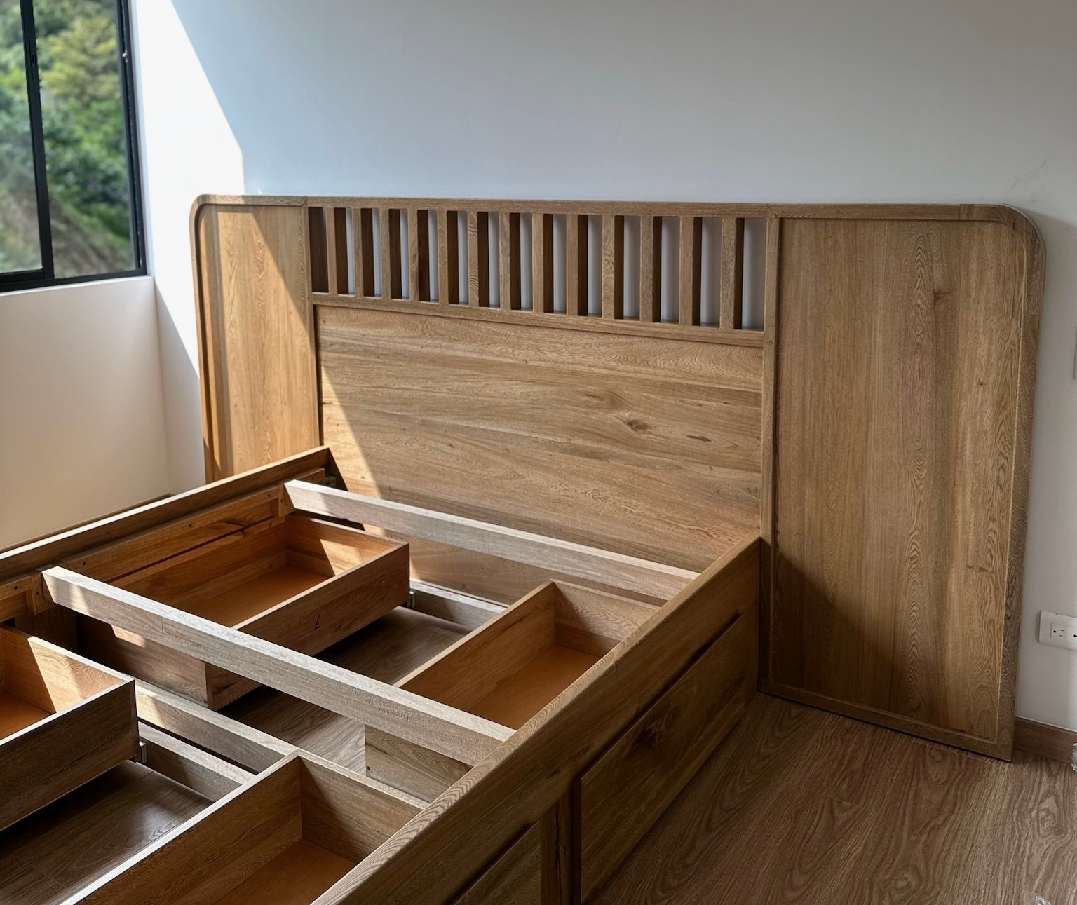 La Cama Dara rinde homenaje a la calidez y nobleza de la madera. Su diseño resalta la belleza natural de las vetas, combinando líneas limpias con una presencia sólida y serena. Cada pieza se elabora artesanalmente en roble macizo, garantizando durabilidad y carácter atemporal.