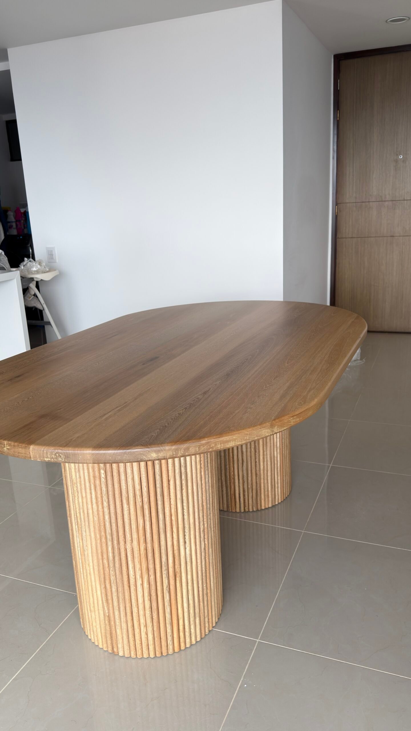 La Mesa de Comedor Solstice evoca equilibrio y sofisticación en su diseño. Sus dos pilares cilíndricos tallados en madera natural no solo brindan un soporte sólido, sino que también añaden un toque artístico al espacio. La forma ovalada de la superficie crea una sensación de fluidez, perfecta para compartir momentos en familia o entre amigos. Fabricada en madera de roble o pino macizo, la mesa Solstice combina a la perfección estilo y durabilidad, siendo una pieza central que eleva cualquier comedor.